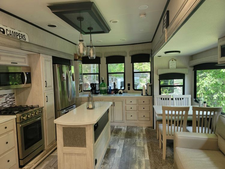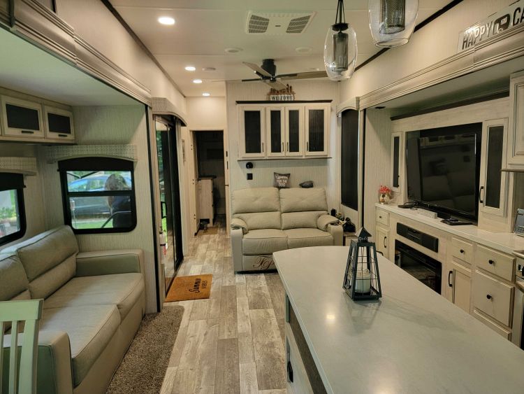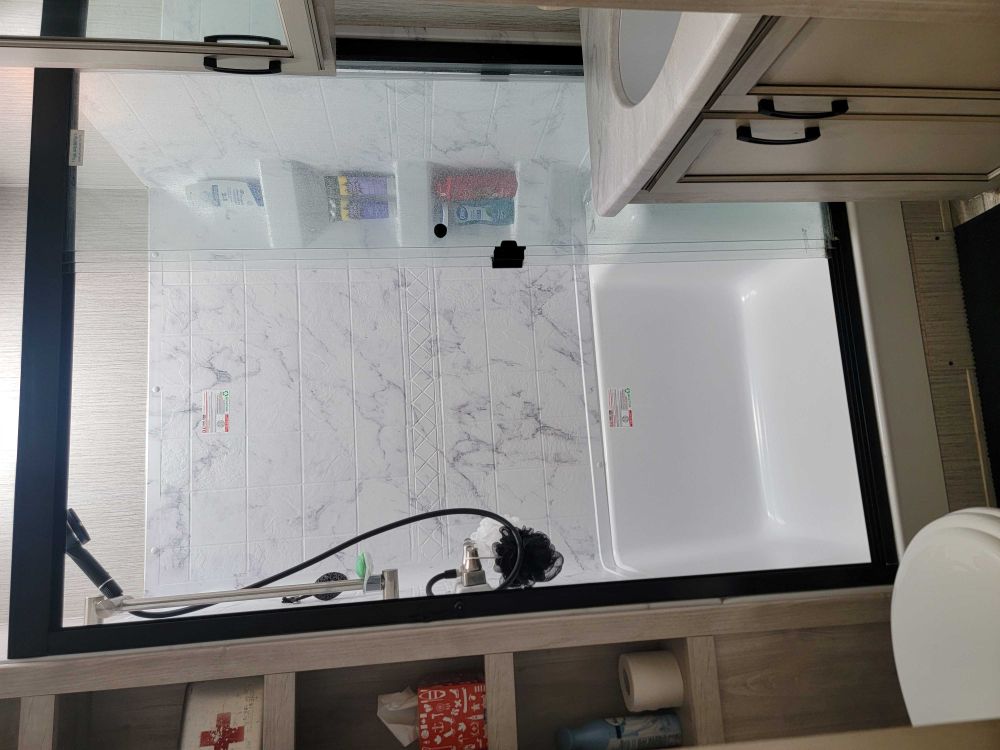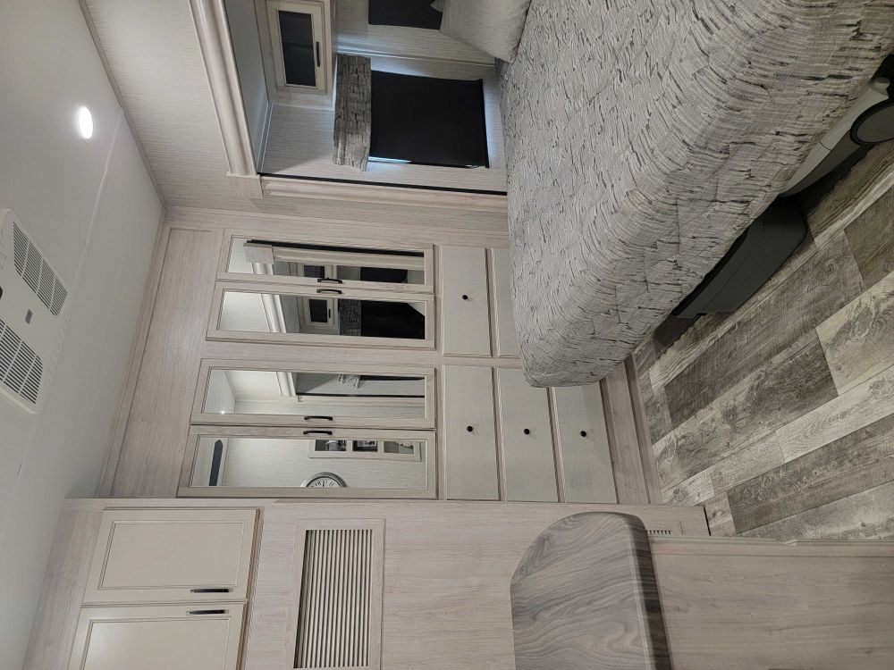 On demand hot water , walk in shower, entertainment center, fire place, trailer is ceramic coated, tinted windows